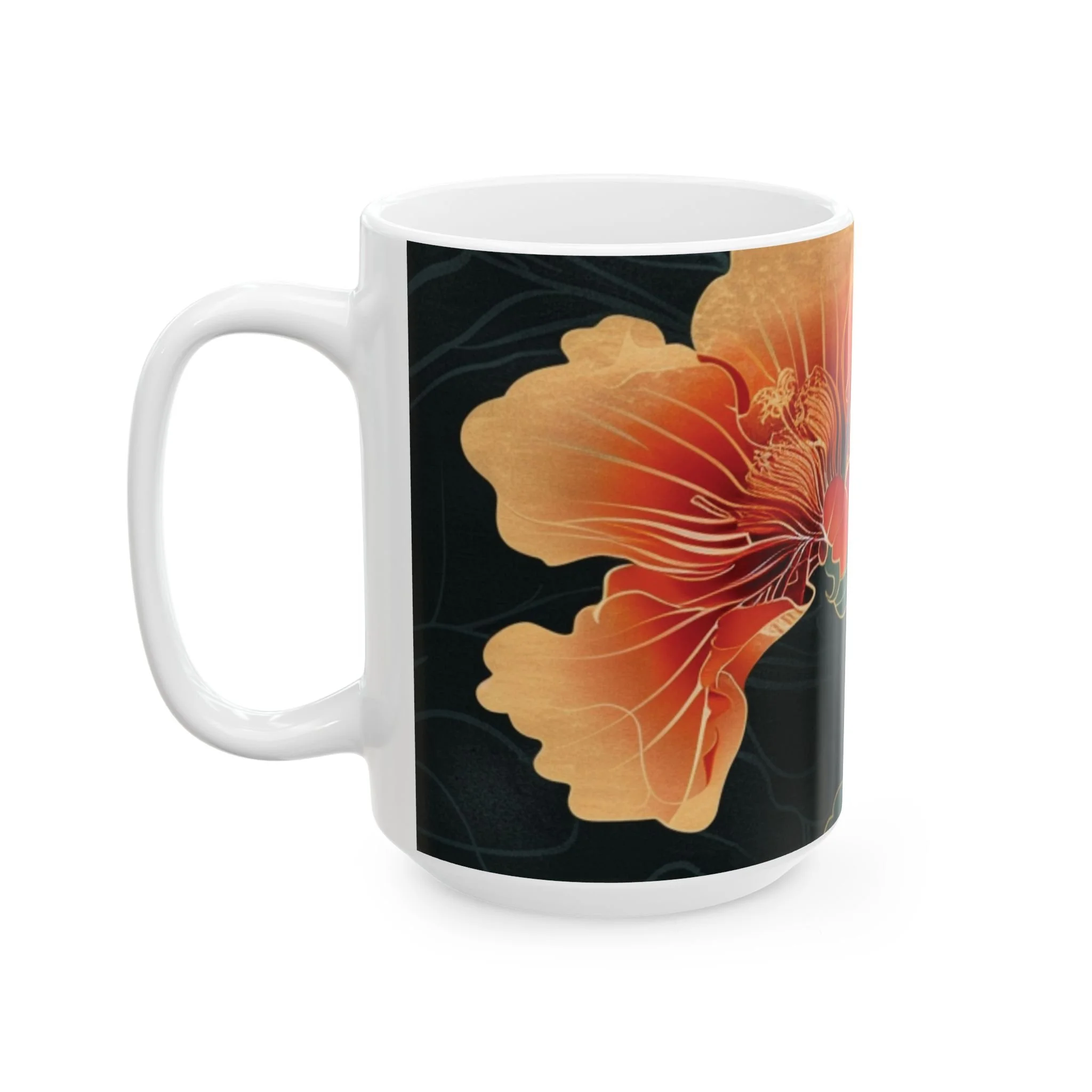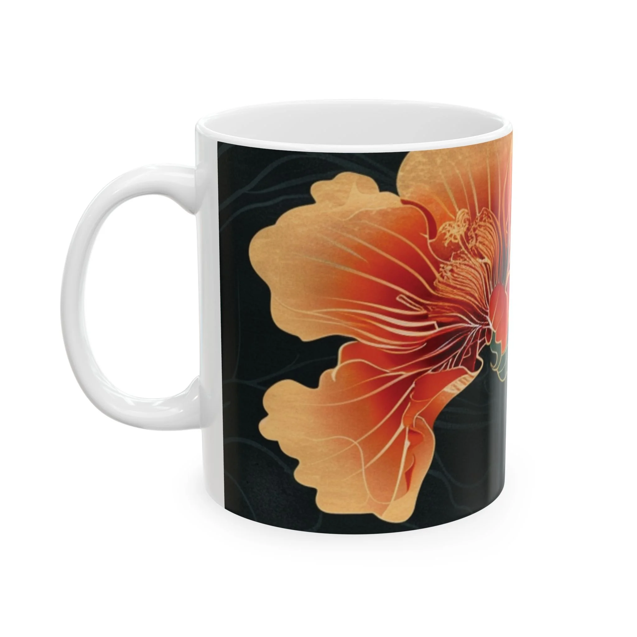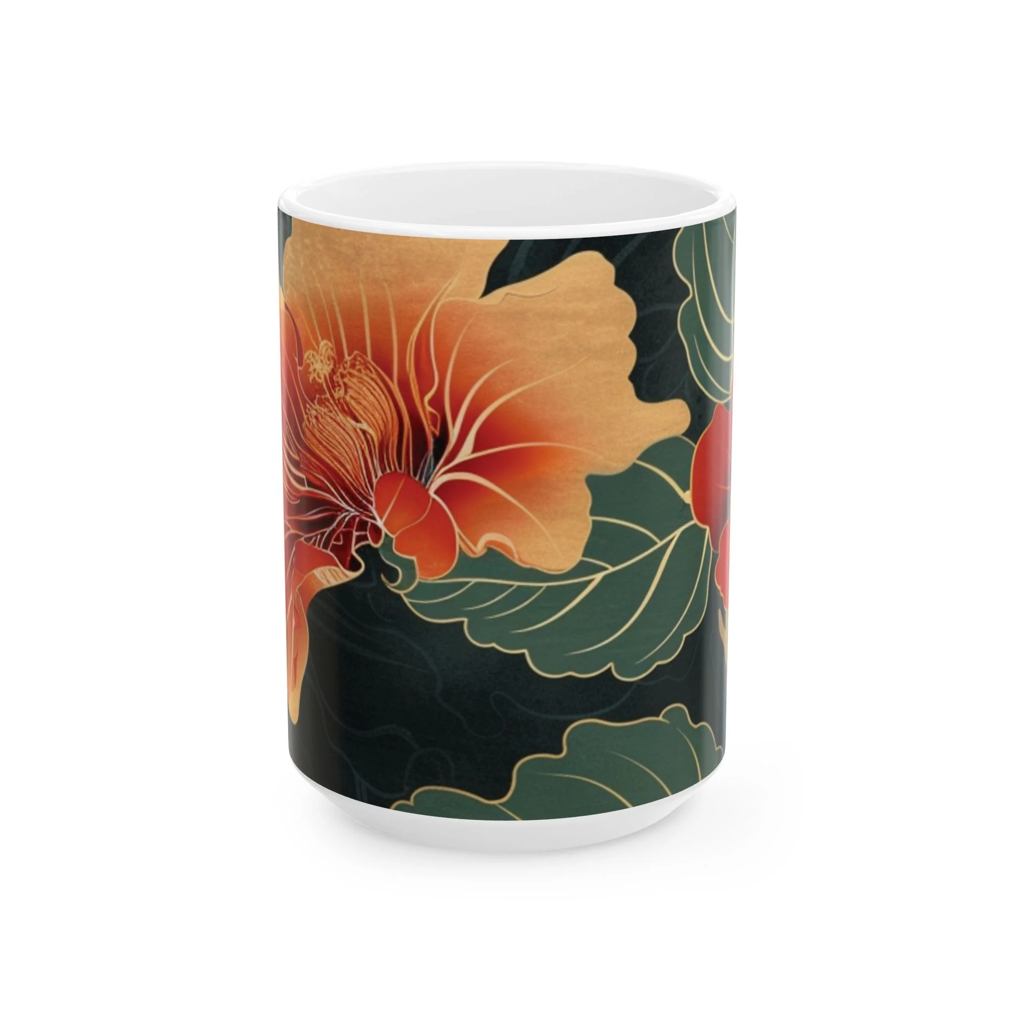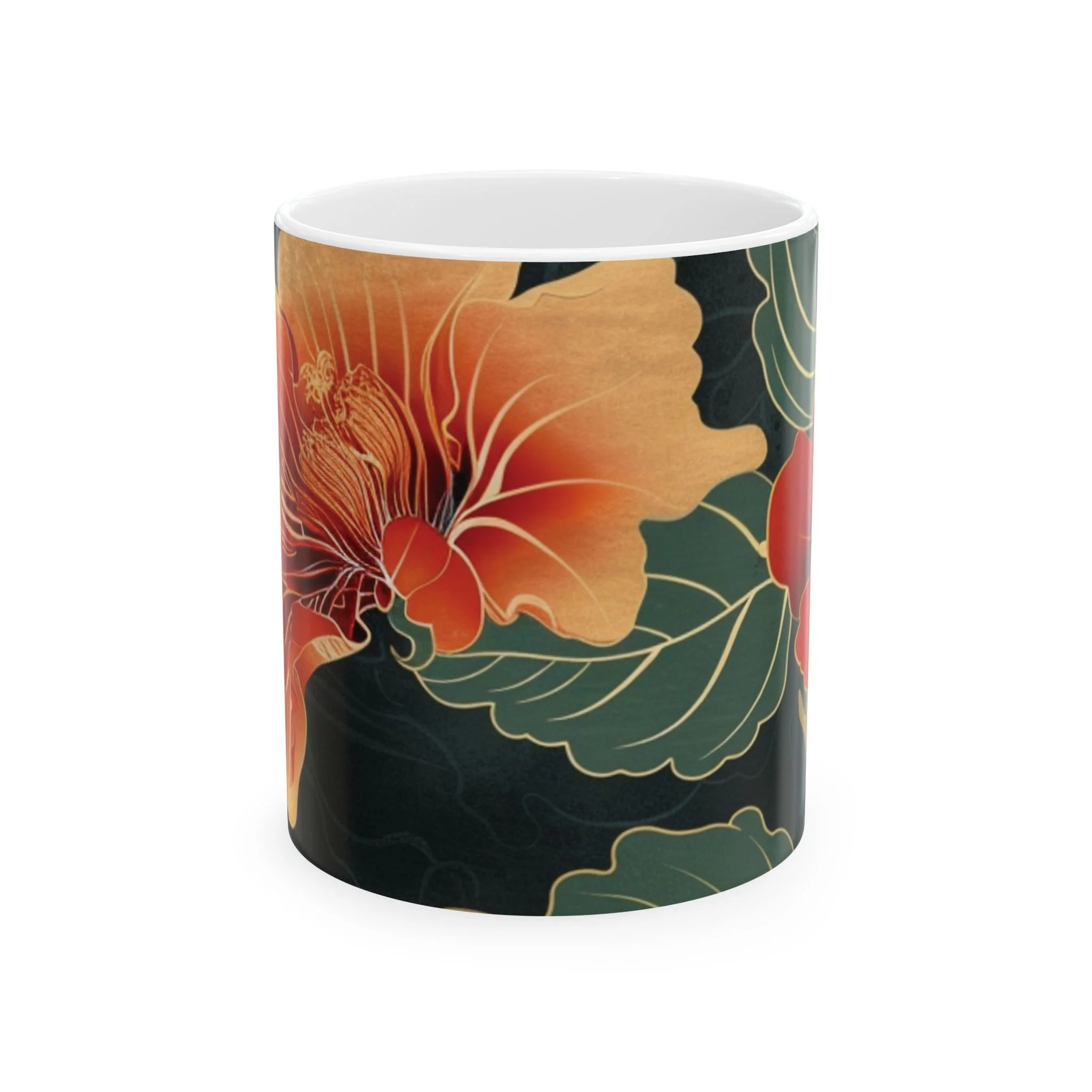 This glossy ceramic mug brings warm, vintage garden energy to your everyday coffee or tea ritual. Deep, inky backgrounds make the hand-drawn hibiscus blooms glow in rich oranges and reds, while layered green leaves add a calming botanical rhythm. The comfortable C-handle and smooth shiny finish invite slow mornings, creative breaks, and quiet conversations. It’s made to withstand daily use—microwave and dishwasher safe, lead- and BPA-free—so the artwork stays bright as it becomes part of your routine. Choose 11oz for a focused espresso-style cup or 15oz when you want an extra pour for longer moments.