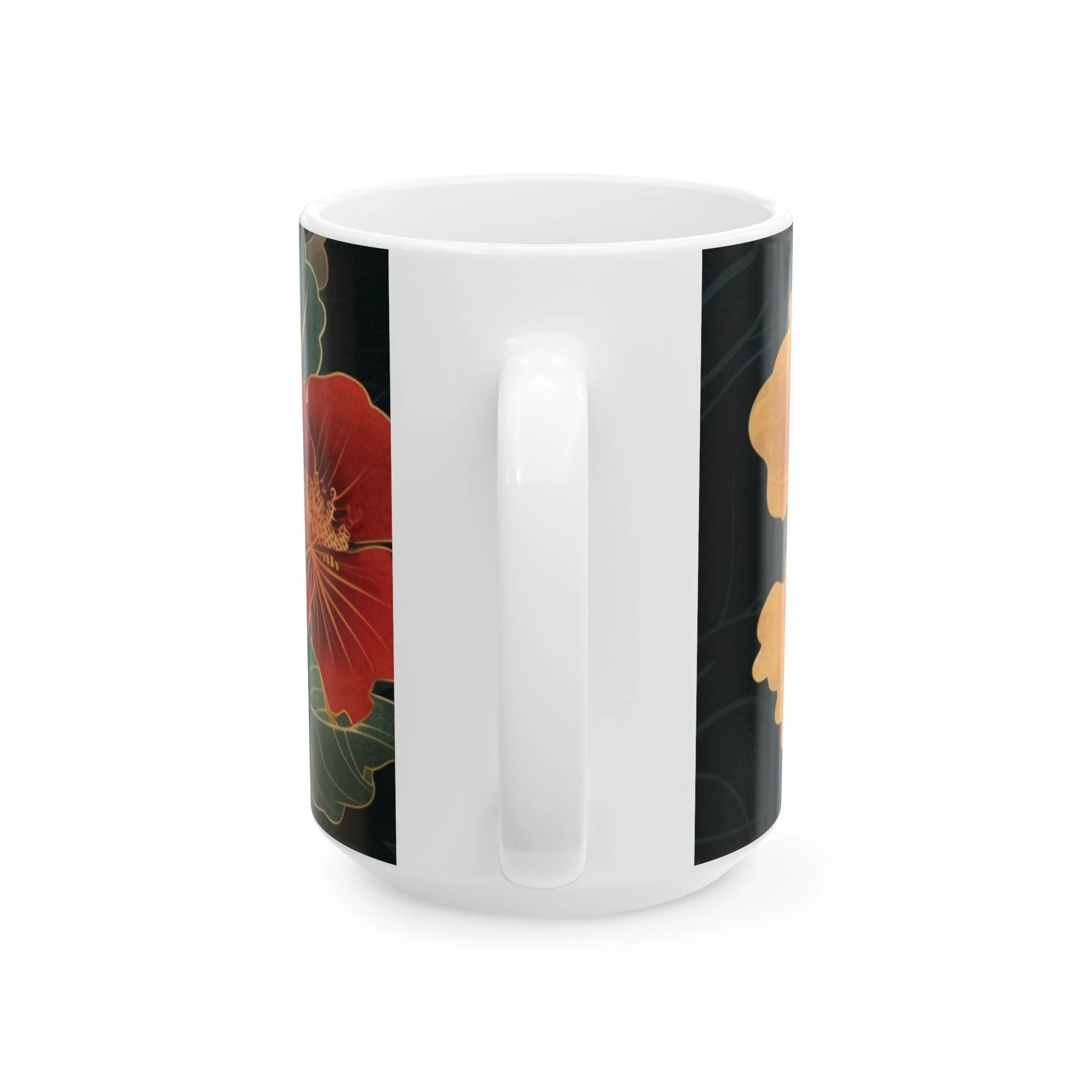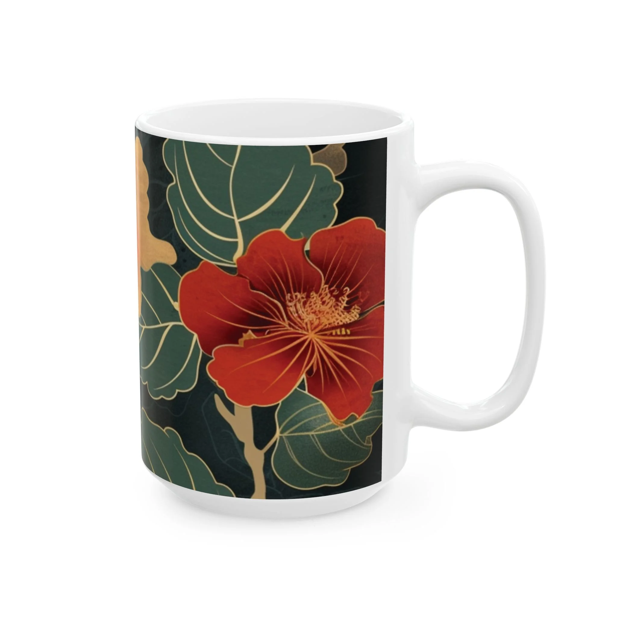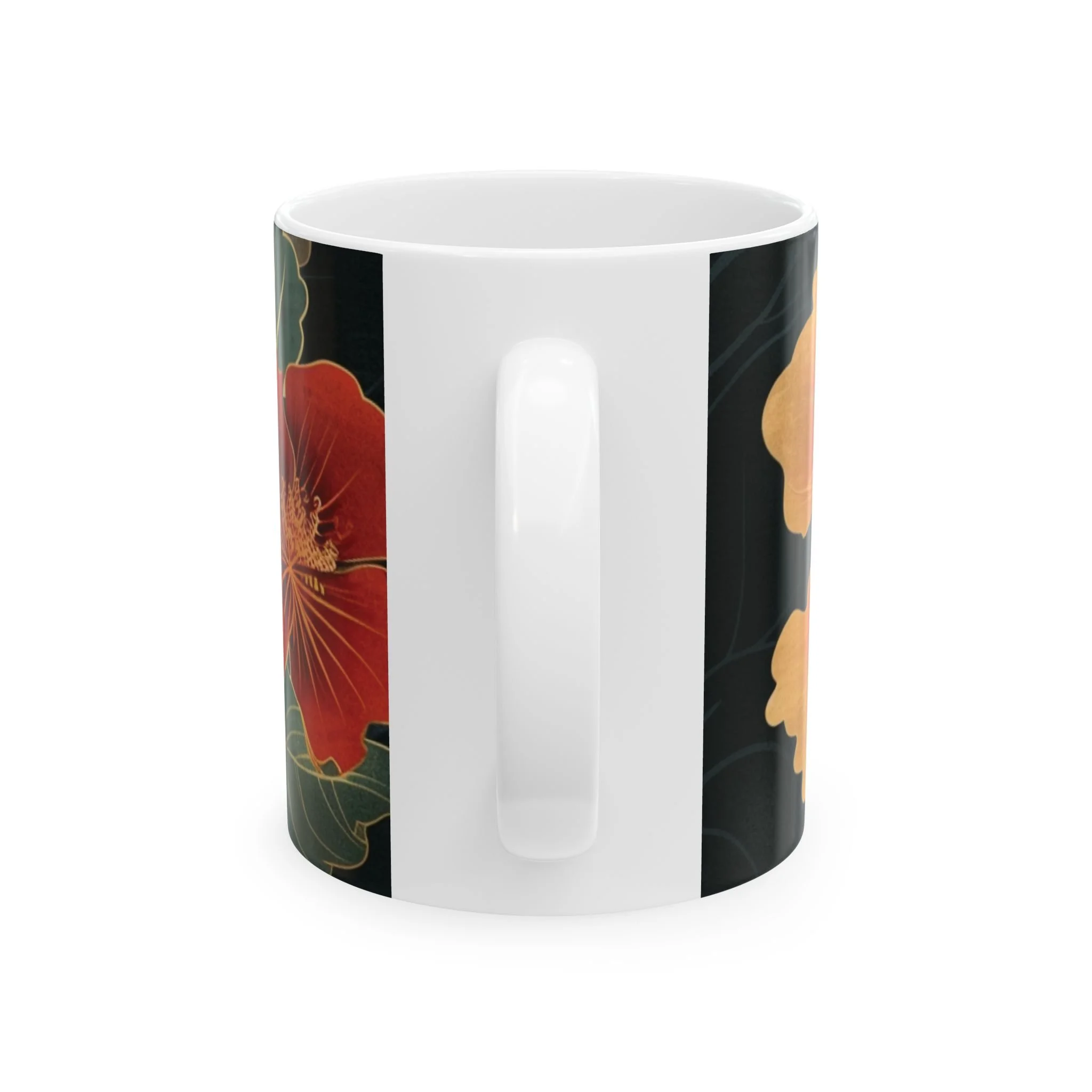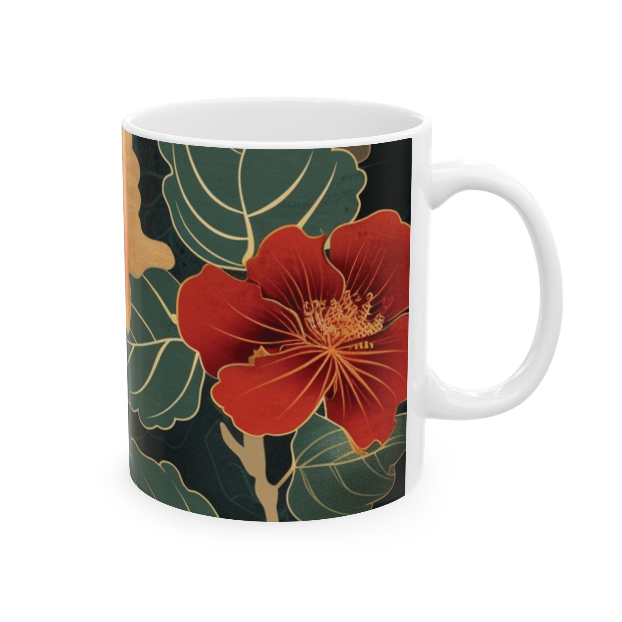 This glossy ceramic mug brings warm, vintage garden energy to your everyday coffee or tea ritual. Deep, inky backgrounds make the hand-drawn hibiscus blooms glow in rich oranges and reds, while layered green leaves add a calming botanical rhythm. The comfortable C-handle and smooth shiny finish invite slow mornings, creative breaks, and quiet conversations. It’s made to withstand daily use—microwave and dishwasher safe, lead- and BPA-free—so the artwork stays bright as it becomes part of your routine. Choose 11oz for a focused espresso-style cup or 15oz when you want an extra pour for longer moments.