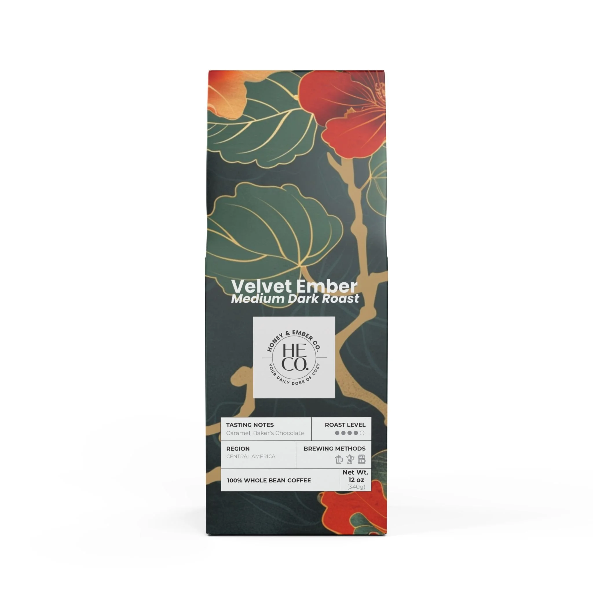 Meet the Velvet Ember Coffee Blend, a bold and rich brew to kickstart your day! This 12oz pack features a medium-dark roast, delivering a deep body with notes of baker's chocolate and caramelized sugar. Meanwhile, the body tastes rich with warm spice, caramel, and dark chocolate-tasting notes that'll leave you craving more. Sourced from Central America, it's perfect for brewing in your drip coffee maker, French press, Moka Pot, or percolator, or enjoying as a refreshing cold brew. Whether you prefer whole bean or ground, we've got you covered. Roasted with care right here in the USA.